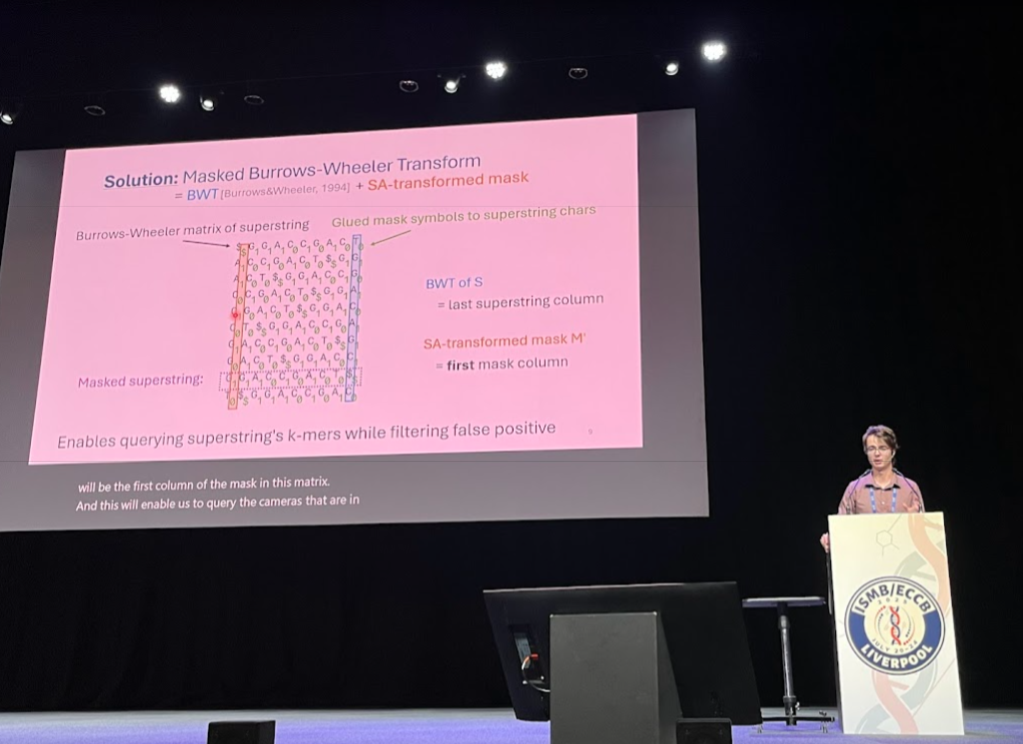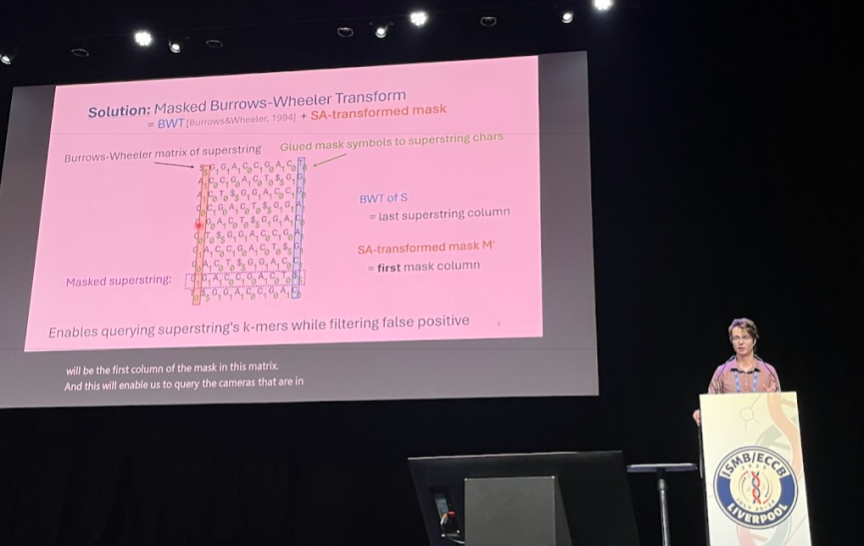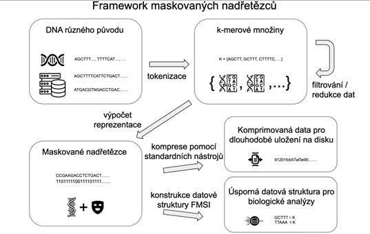 Jednou z velkých výzev současné bioinformatiky je, jakým způsobem se vypořádat s exponenciálním nárůstem genetických dat v databázích. Technikou, která se čím dál častěji používá k částečnému řešení tohoto problému, je reprezentovat genetická data pomocí množin k‑merů, tedy všech podřetězců délky k z nějakého řetězce DNA, který může pocházet z jednoho či více organismů nebo přímo z prostředí. A právě efektivní reprezentací množin k-merů se zabývá moje práce. Hlavním přínosem je nový a úspornější způsob reprezentace k-merových množin. Takzvané maskované nadřetězce (masked superstrings) sestávají z nadřetězce, tedy řetězce obsahujícího všechny k‑mery, a binární masky, která říká, jaké k‑mery jsou v nadřetězci skutečně obsaženy. Kromě toho se práce zabývá například tím, jak tyto maskované řetězce efektivně počítat, a také paměťově efektivními datovými strukturami založenými na maskovaných nadřetězcích.