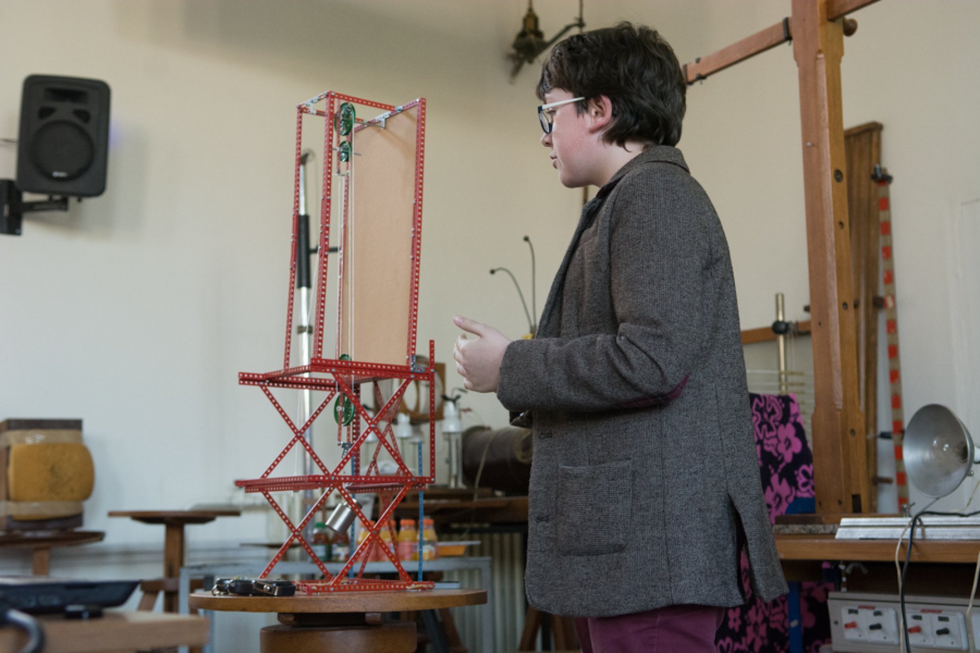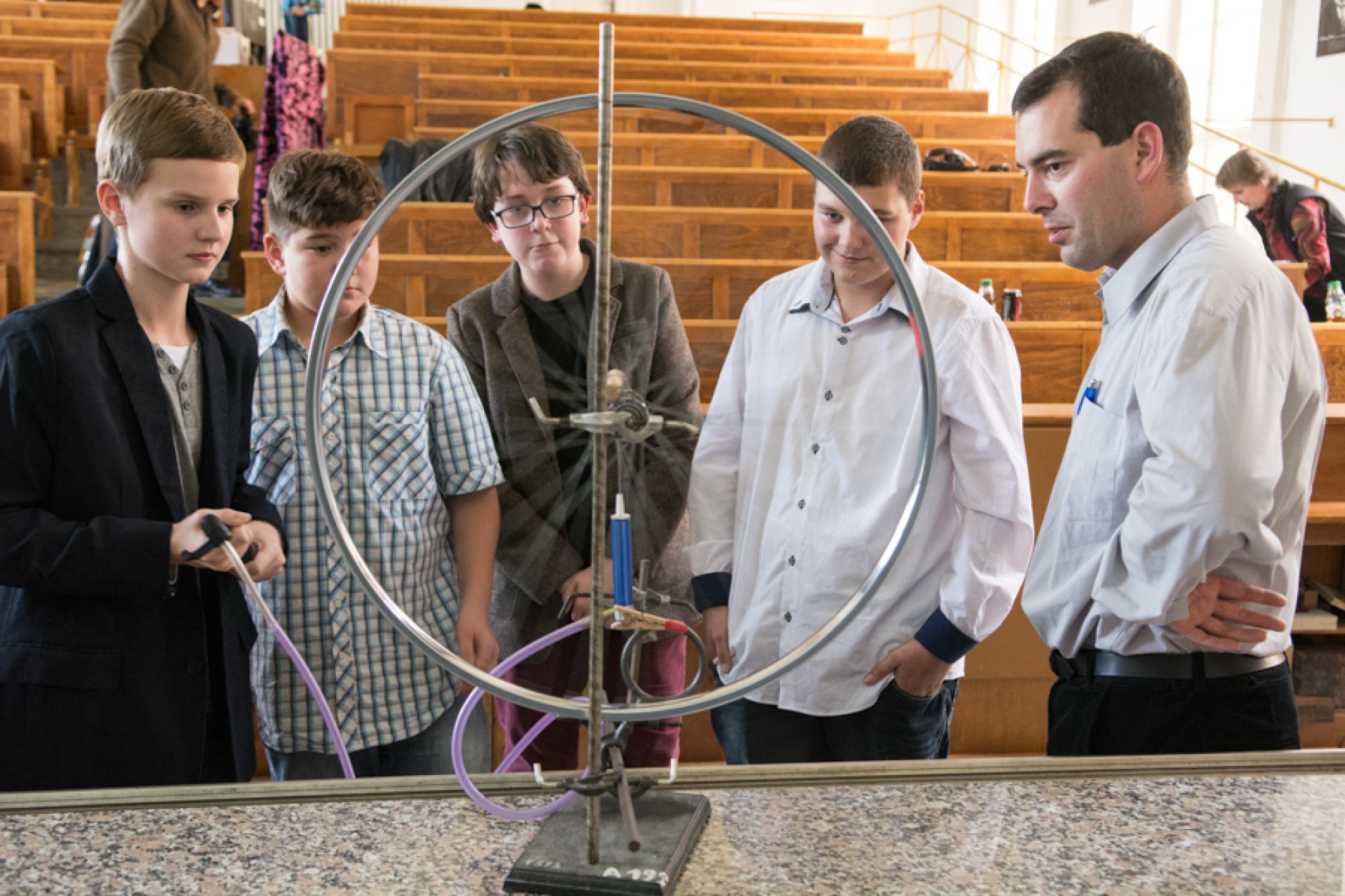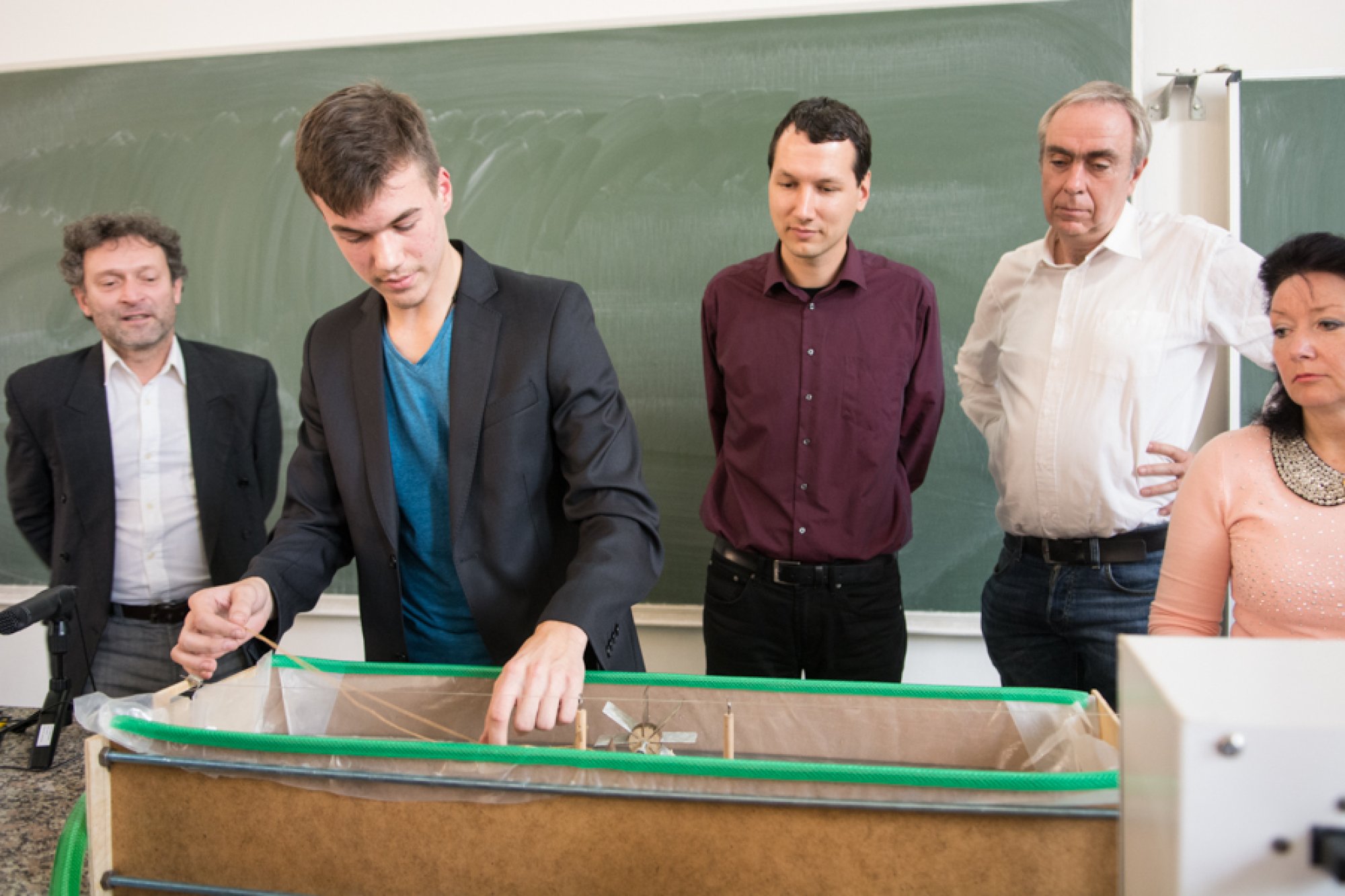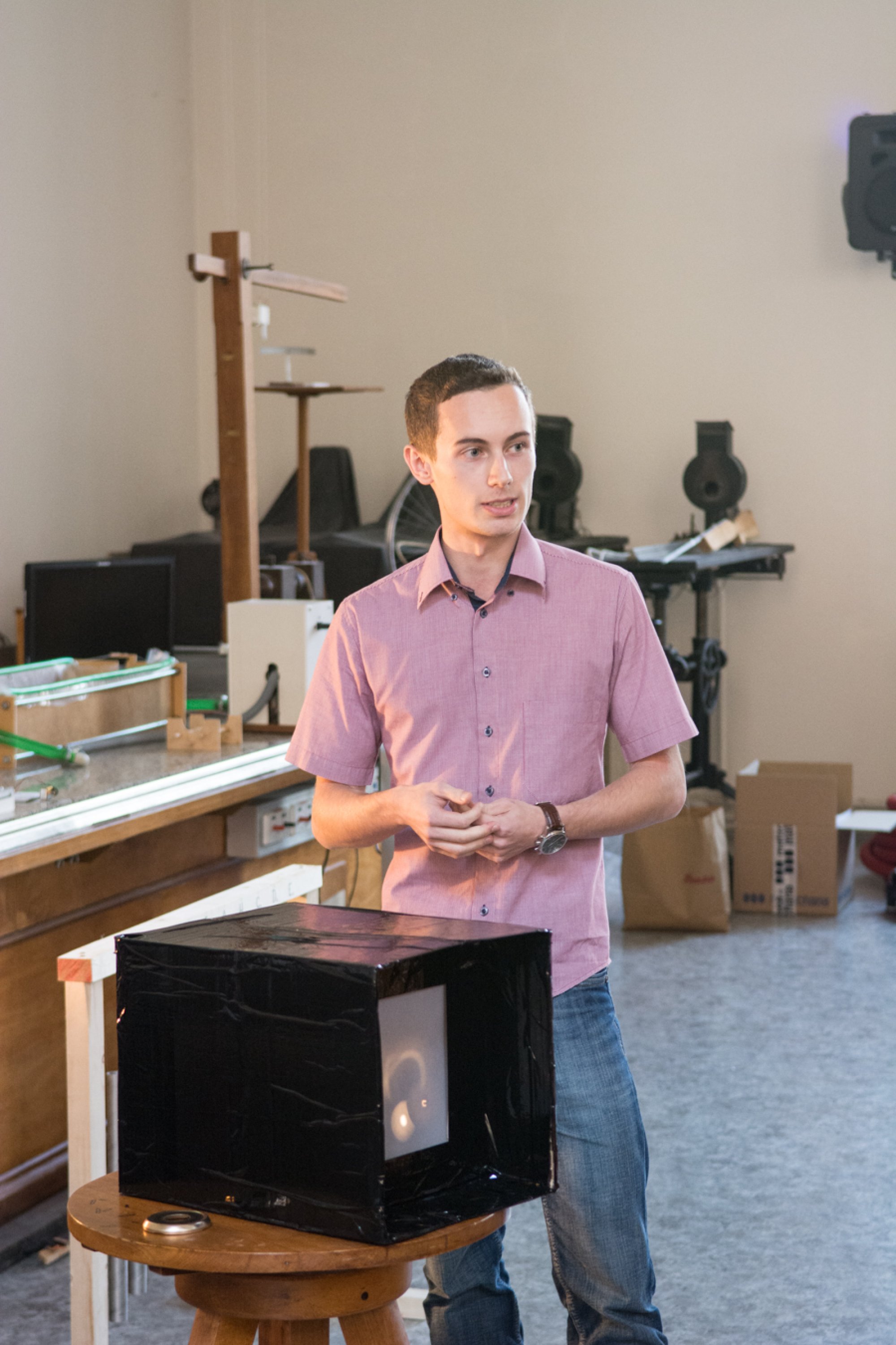 Sérii fyzikálních demonstrací otevřel Petr Bazgier s modelem lodi na vodní pohon. Vytvořil plovoucí mechanický model, který fungoval podobně, jako pracovali tahači lodí a vorů v carském Rusku. Porotu i diváky zaujalo mimo jiné precizní provedení téměř dva metry dlouhého modelu.