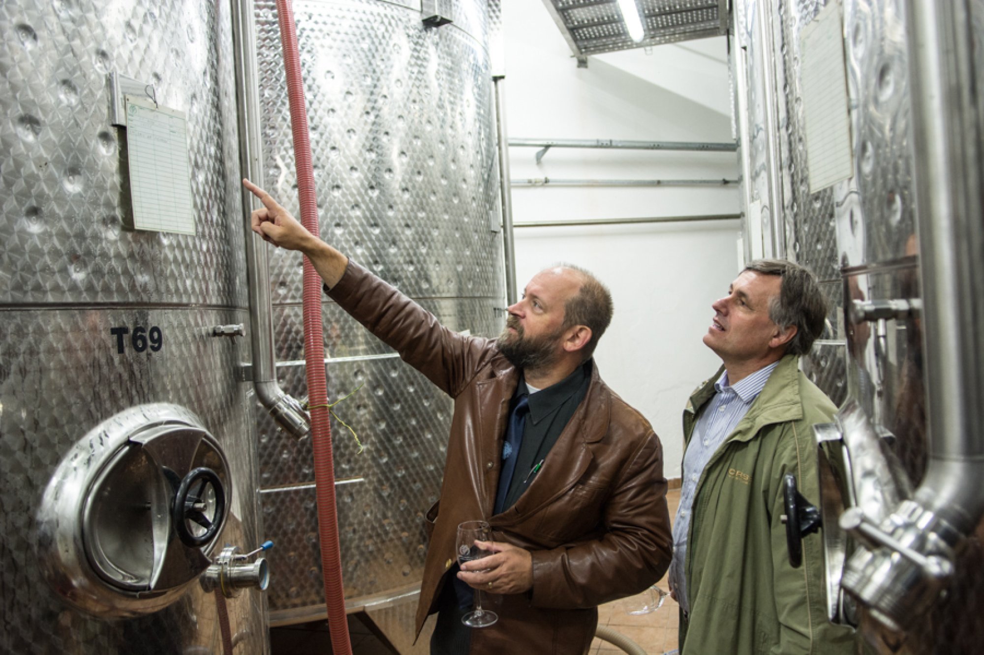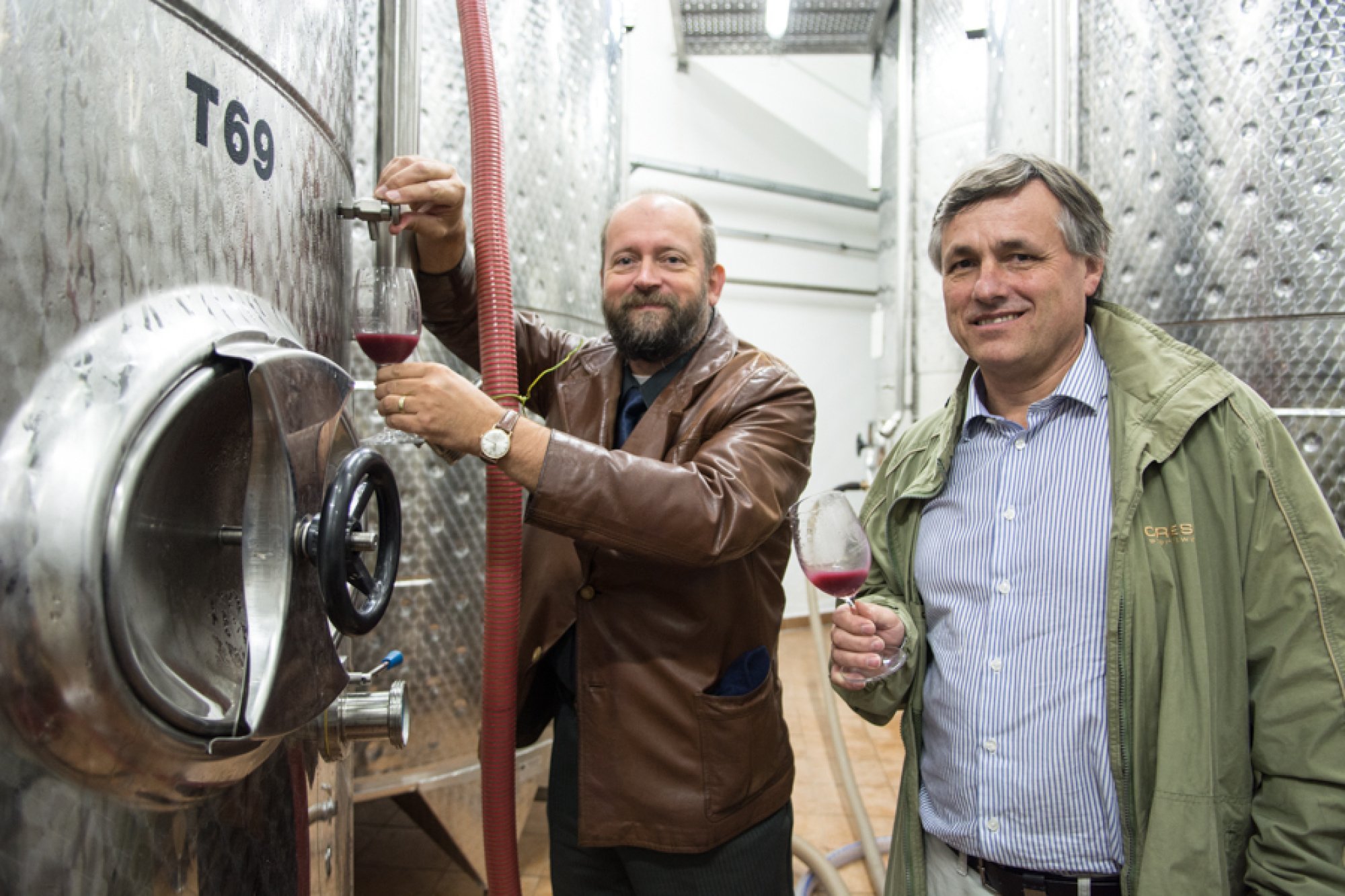 Slavnostnímu podpisu smlouvy předcházela návštěva děkana prof. Jana Kratochvíla a dalších zástupců fakulty přímo ve Znovínu v Šatově. Měli tak možnost zažít atmosféru prostředí, ve kterém se mimo jiné brzy zrodí exkluzivní edice matfyzáckých vín. „Protože nás zajímá osud vína, které bude ‚naše‘, šli jsme se podívat do výroby. Mimo jiné jsme měli příležitost prohlédnout si nerezové nádoby, ve kterých právě začínal fermentovat mošt,“ popisuje detaily návštěvy děkan fakulty prof. Kratochvíl. „Právě během jednání s Ing. Pavlem Vajčnerem, ředitelem Znovínu, vykrystalizovala myšlenka na spolupráci v oblasti vývoje,“ upřesňuje.