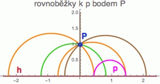 Těm oranžovým hraničním „rovnoběžkám“, které přímku p jen tak „líznou“ (a protínají ji pouze v ideálních bodech, které plošníci nevidí), říkáme limitní rovnoběžky (takový pojem v eukleidovské geometrii vůbec neexistuje). Ty tedy v bodě P představují jakousi „přepážku“ mezi přímkami protínajícími p a rovnoběžkami k p (v kruhovém modelu je situace znázorněna zde).
