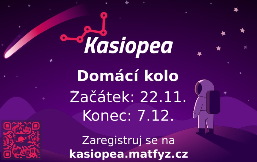 Do soutěže se můžete zaregistrovat na kasiopea.matfyz.cz, kde vedle dalších informací najdete také různé tutoriály, které vám mohou být nápomocné při řešení úloh. Pro další novinky můžete sledovat náš Facebook a nově nás najdete také na Instagramu.