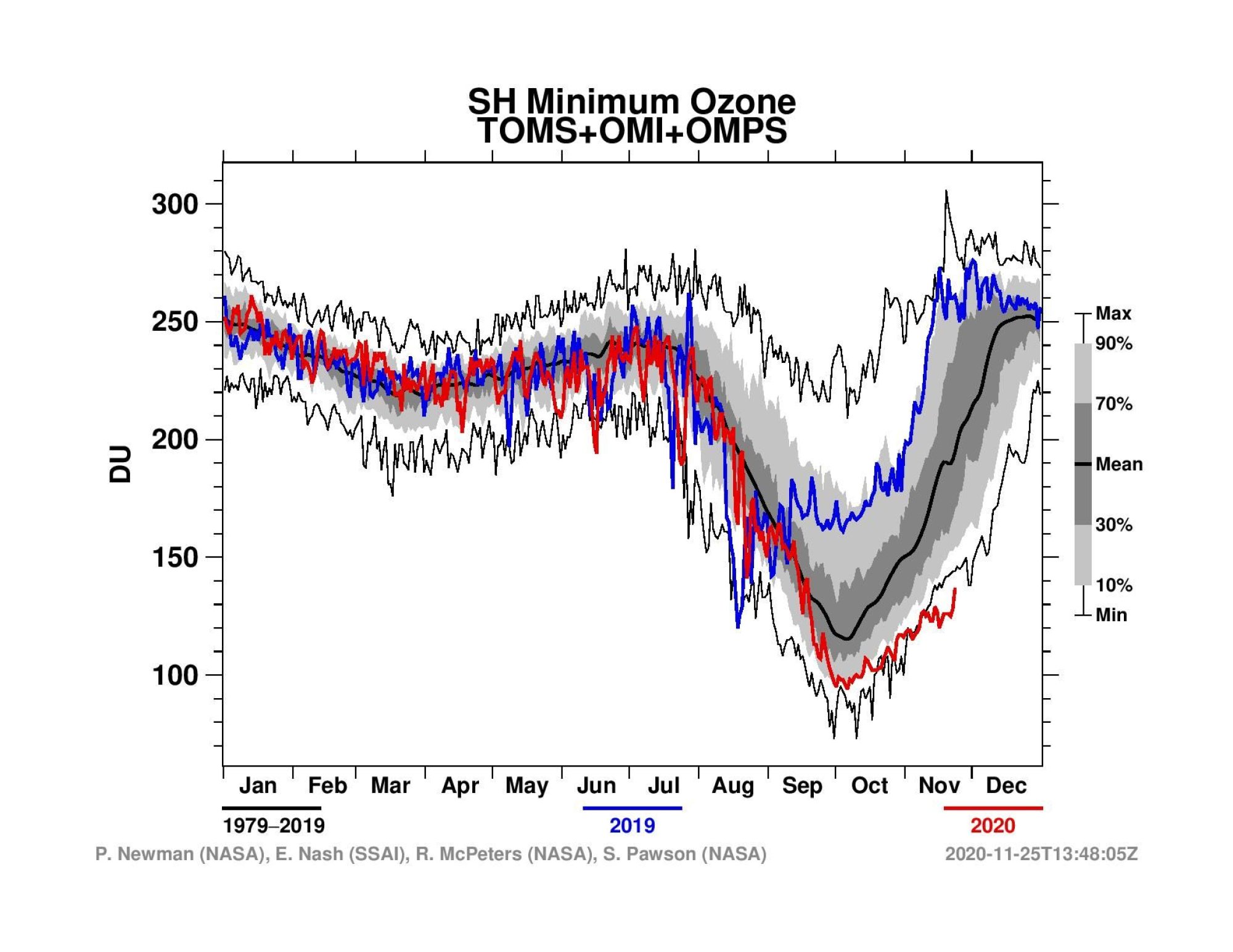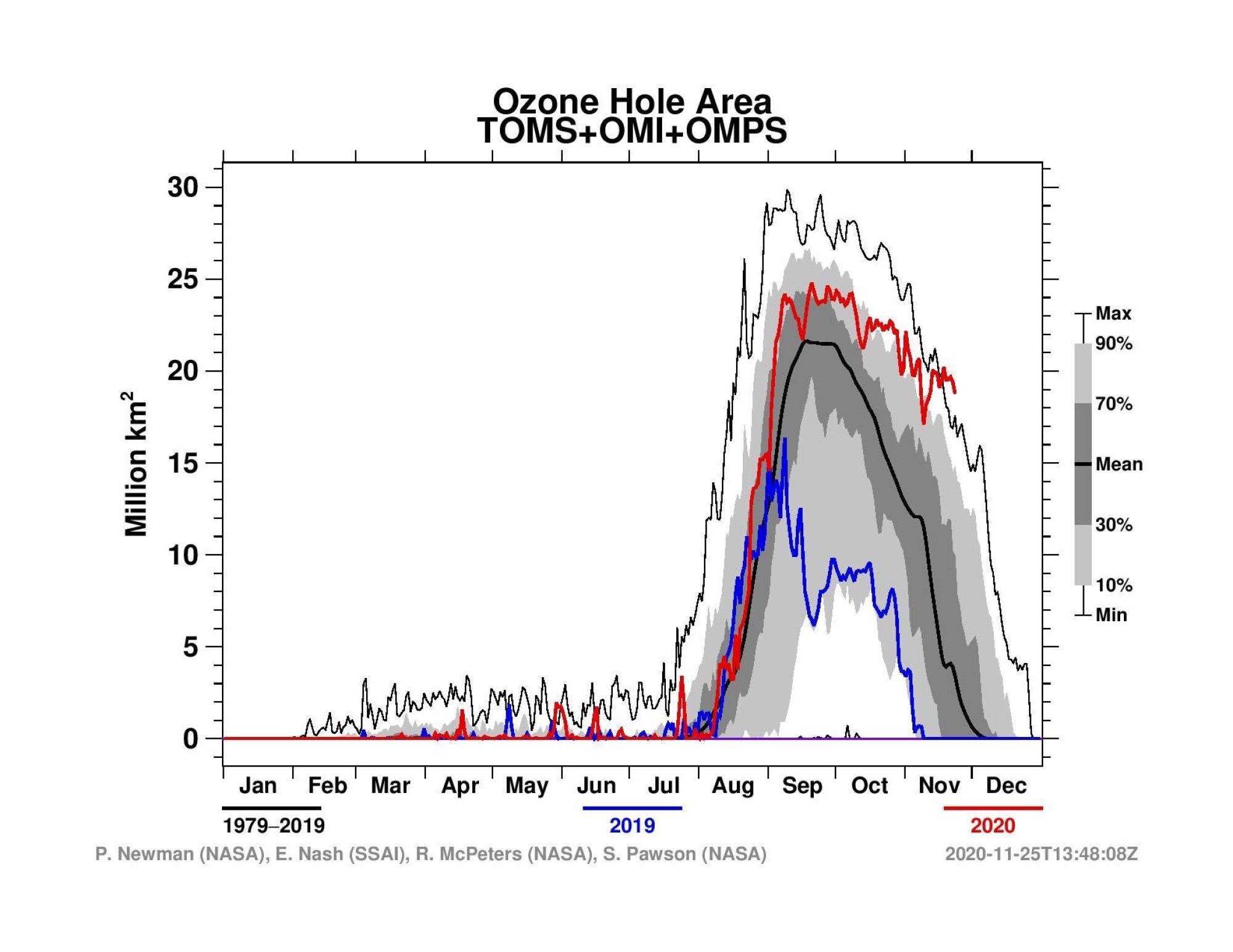 Ozonová díra letos rychle narůstala od poloviny srpna a největšího rozsahu dosáhla v září, kdy pokrývala téměř 25 milionů km2. Je to také 14. nejhlubší ozonová díra za 33 let měření pomocí balónu. Dle NASA Ozone Watch, která její rozlohu monitoruje, klesla koncentrace stratosférického ozonu začátkem října těsně pod hodnotu 100 DU (Dobsonových jednotek).