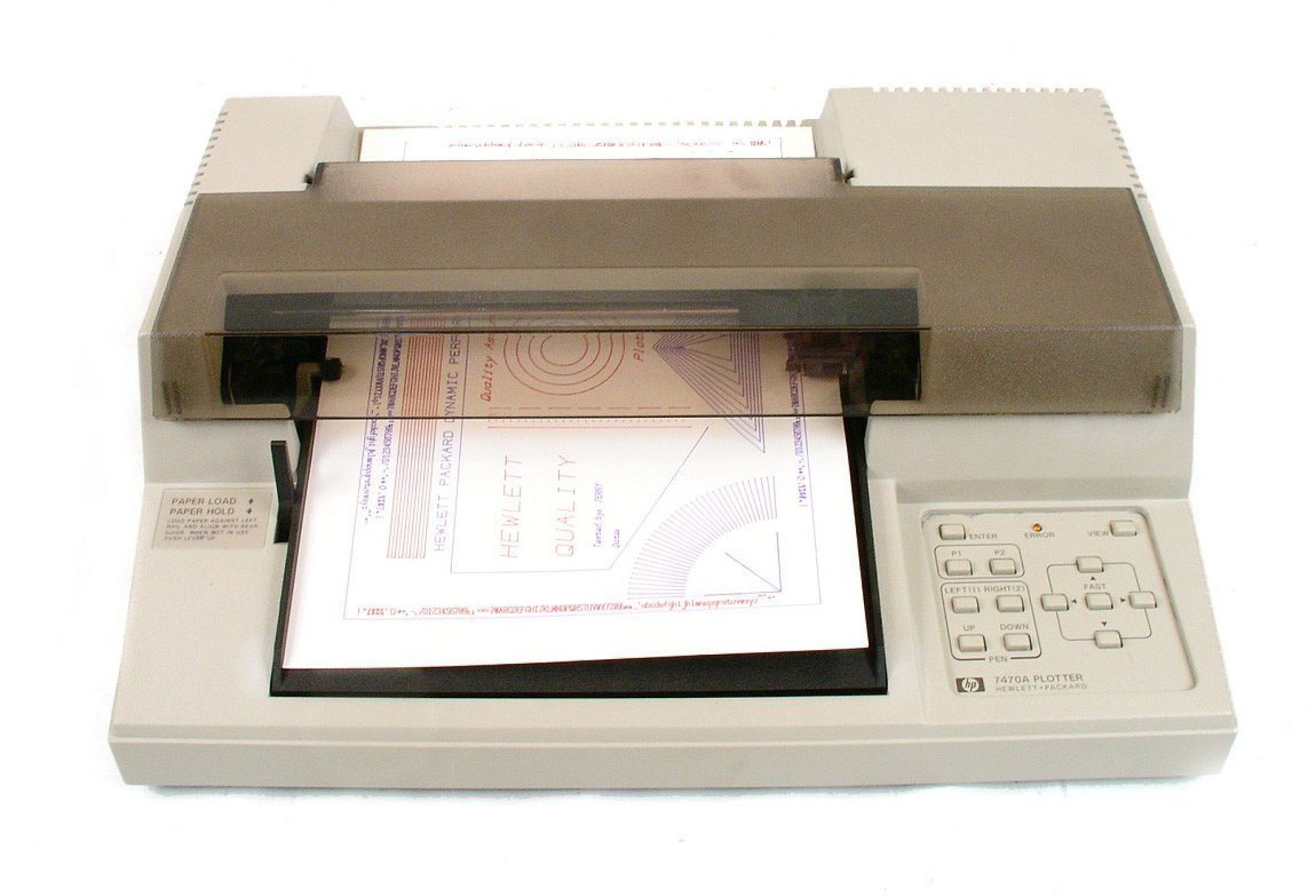 V další době se postupně objevila celá řada řešení a různých výrobců kreslicích zařízení. Zajímavé řešení přinesla firma Hewlett-Packard v roce 1982 s plotry řady 7470 (obr. 4). Pero se pohybuje po liště, avšak pohyb papíru (formátu A4) je zajištěn přítlačným válečkem a poháněnými kolečky s hrubou strukturou (jakoby „naneseným pískem“ – grit wheel). Způsob uchycení per umožňoval jejich programovou výměnu (obr. 4).