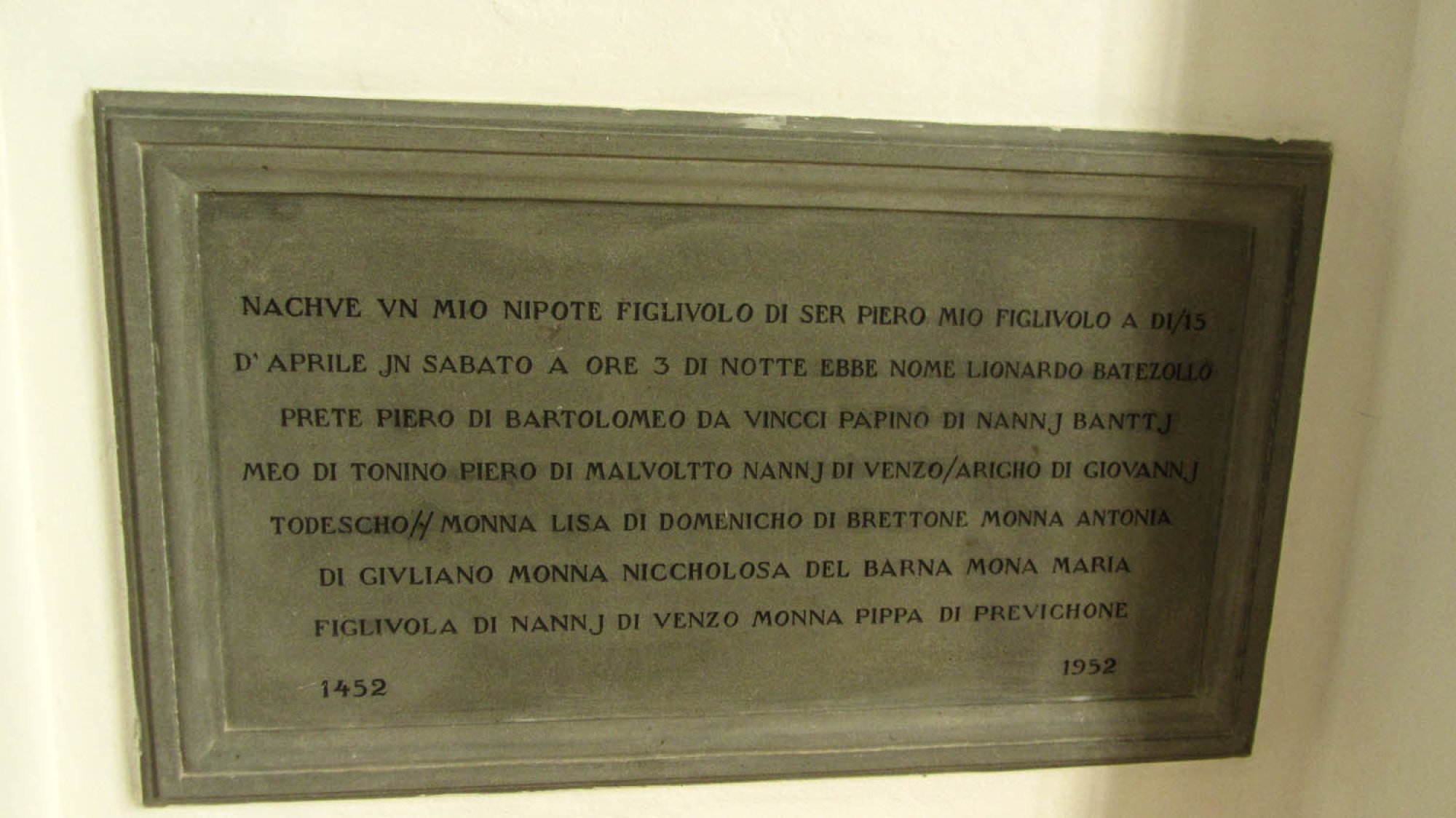Necelou hodinu jízdy od „Athén středověku“ (tedy Florencie) se nachází malebné městečko Vinci. V jedné z jeho částí, malé vesničce Anchiano, se narodil a na hradě svých patronů ve středu městečka Vinci své dětství prožil velikán středověku Leonardo (Lionardo) di ser Piero da Vinci (* 15. 4. 1452, Anchiano u Vinci, Itálie; † 2. 5. 1519, Amboise, Francie). Ač málokteré dílo dotáhl do konce, za génia ho označují nejen malíři, architekti a biologové, ale i matematici a fyzici, neboť empirické bádání povýšil na metodu a byl přesvědčen o tom, že základem všeho je matematika.