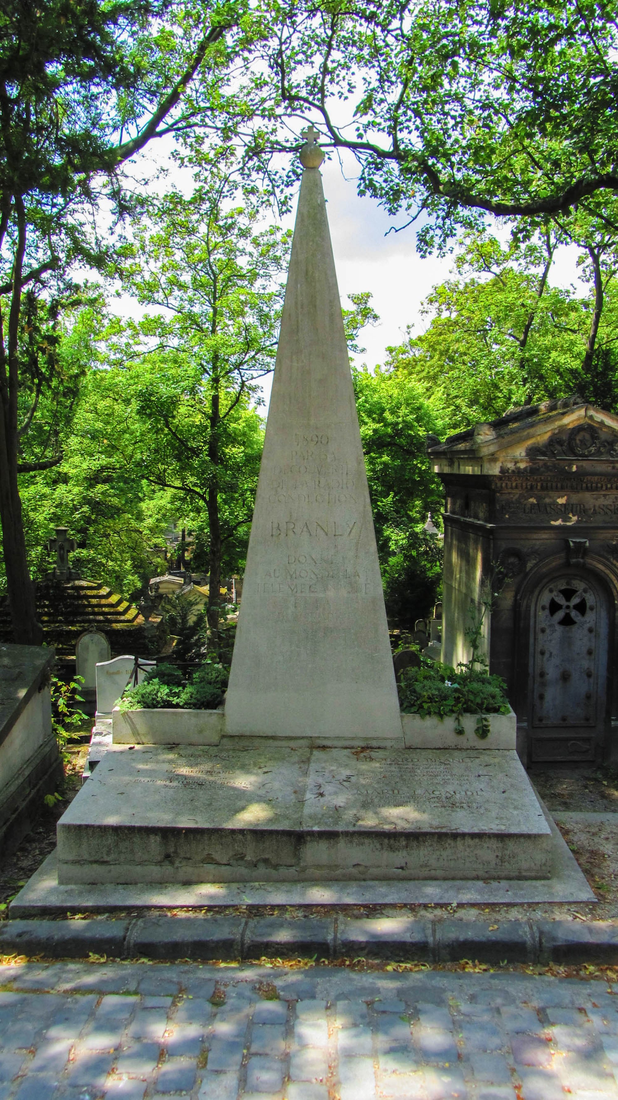 U telegrafu ještě zůstaneme. Vynálezce, vzdělanec a fyzik Édouard Eugène Désiré Branly (* 23. 10. 1844, Amiens, Francie; † 24. 3. 1940, Paříž, Francie) má nepřehlédnutelný hrob v 10. oddělení (foto č. 6). Branly byl autorem tzv. kohereru, tedy prvního detektoru elektromagnetického vlnění, který byl využitelný v praxi k zachycování signálu na velké vzdálenosti. To umožnilo rozvoj bezdrátové telegrafie. Édouard Branley byl také od roku 1911 členem Francouzské akademie věd, kam byl přijat s náskokem pouhého jednoho hlasu před Marií Skłodowskou-Curie. Zajímavostí je, že po Branlyově smrti byl na uvolněné místo zvolen Frederic Joliot, tedy zeť Skłodowské. Koherer upadl v zapomnění po vynálezu polovodičových detektorů, přesto ale stál u zrodu mnoha nápadů řady vynálezců. Například Guglielmo Marconi jeden z prvních bezdrátových telegramů poslal jako poklonu a poděkování právě Branlymu.