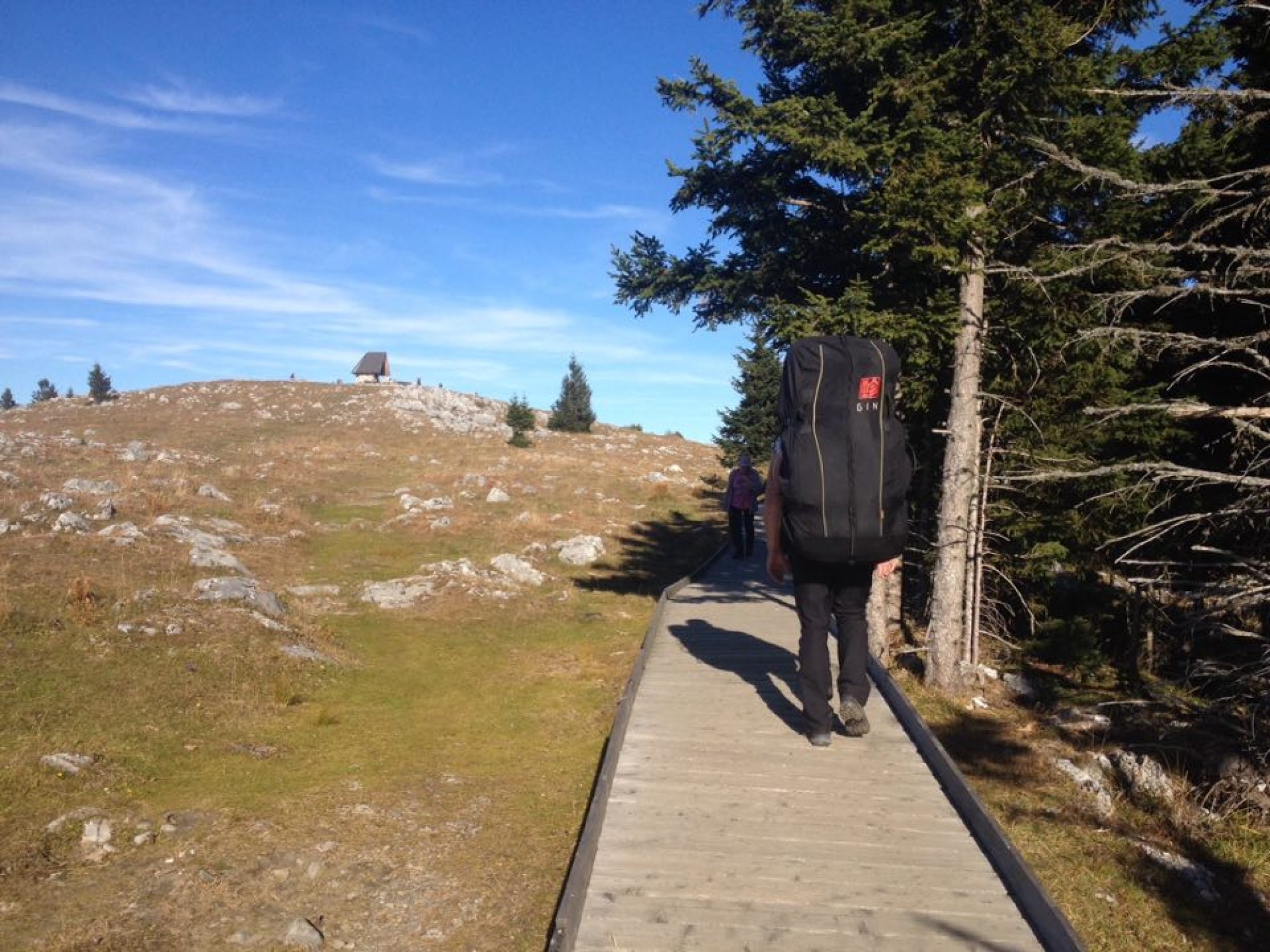 Kopec Schöckl, na jehož vrchu začínáme, měří 1445 m. Na jedné straně se z něj otevírá výhled na hřebeny Alp, které se táhnou až k obzoru, na druhé straně se rozprostírá nekonečná rovina mizející kdesi v Maďarsku. Dostávám základní instruktáž. Oba se oblékáme do postrojů, které mi částečně připomínají lezecký sedák a částečně dětskou autosedačku.