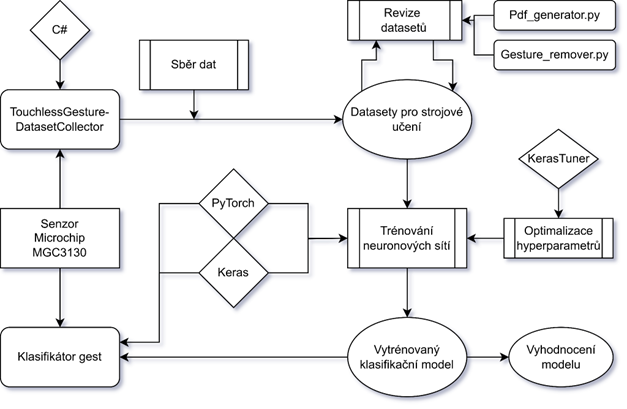 Také jsem navrhl a implementoval nástrojový řetězec, který zahrnuje sběr, anotaci a úpravy trénovacích dat, trénování neuronových sítí a živou klasifikaci gest ze senzoru.